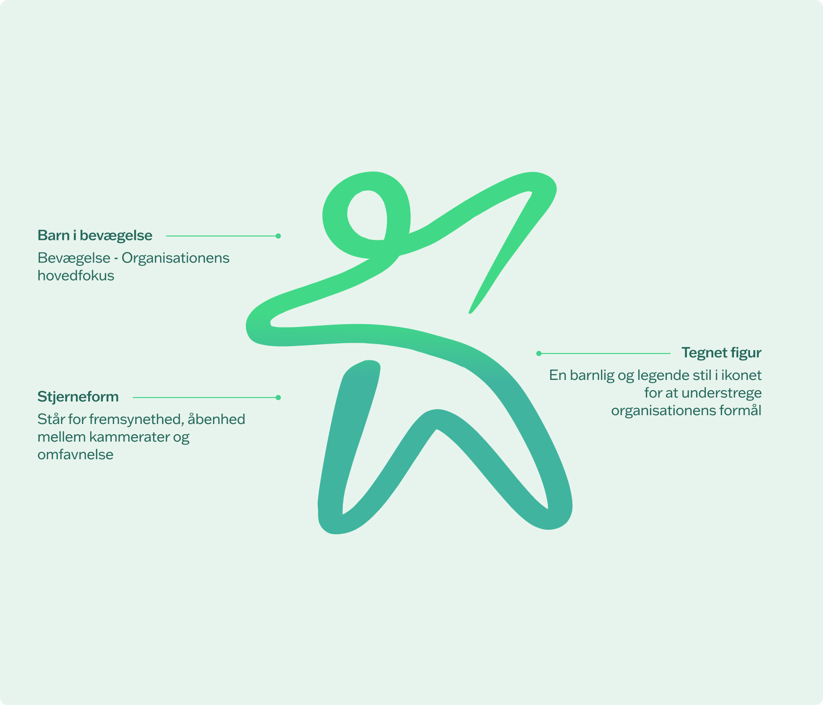 Logoet er skabt på baggrund af en grundig designproces, som udover workshops med Dansk Skoleidræt bestod af inspiration fra bl.a. børnetegninger og billeder af børn i bevægelse. Det lille ikon i logoet er f.eks. en sammensmeltning af en stjernetegning og et billede af et barn i bevægelse.