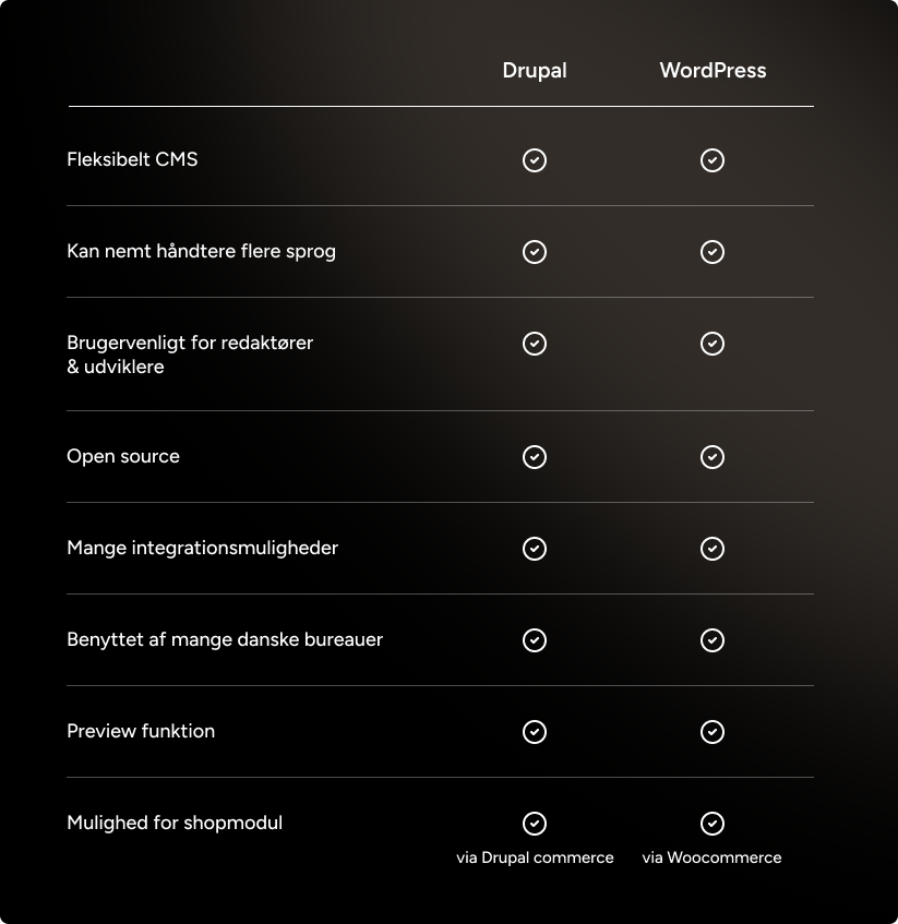 Hvis din hjemmeside eller dit system er meget komplekst, for eksempel store enterprise-funktioner, komplicerede workflows eller avanceret brugeradministration, så er Drupal typisk det stærkeste af de tre systemer. Drupal er udviklerorienteret, og dets struktur gør det nemt at bygge skræddersyede løsninger med høj grad af kontrol over data og logik.