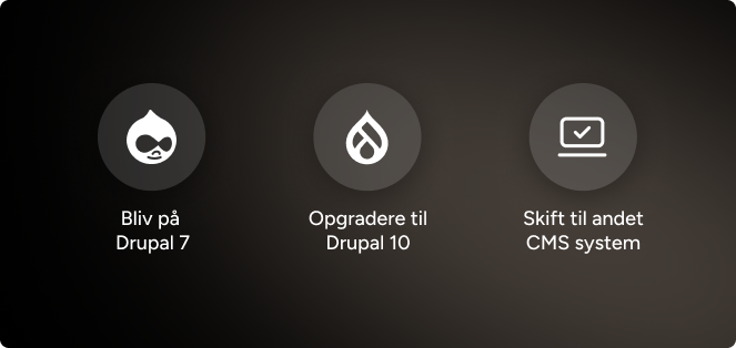 Hvis du eller din organisation stadig bruger Drupal 7 (eller en anden EOL-version), så finder du her de primære handlingsmuligheder, samt fordele og ulemperne ved de forskellige, som du skal tage med i dine overvejelser.