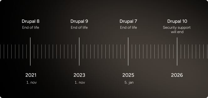 Når en såkaldt “major” version af Drupal når “end of life” (EOL), betyder det konkret, at Drupal-fællesskabet, altså kerneudviklerne, sikkerhedsteamet og andre bidragere til Drupal, stopper med at levere følgende: