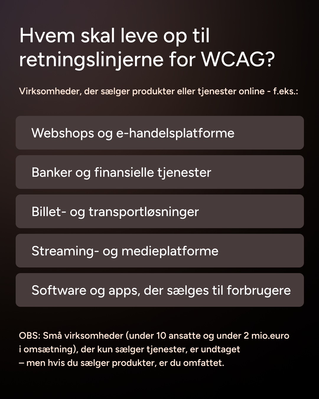 WCAG står for Web Content Accessibility Guidelines. Det er de internationale retningslinjer, som hjælper dig med at bygge websites og apps, der er tilgængelige for alle.