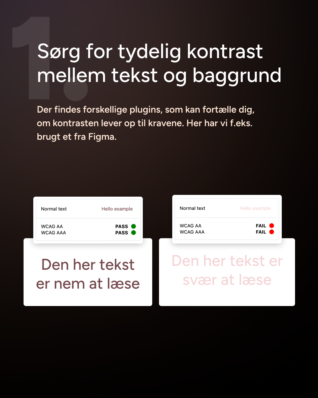 Sørg for, at der er tydelig kontrast mellem tekst og baggrund. Lav kontrast = lav læsbarhed, især for dem med nedsat syn.