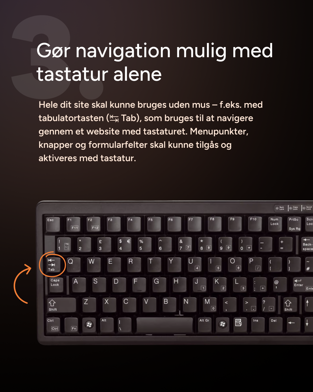 Kan man bruge dit site uden mus? Hvis ikke, er der plads til forbedring. Brug Tab-tasten og test selv.