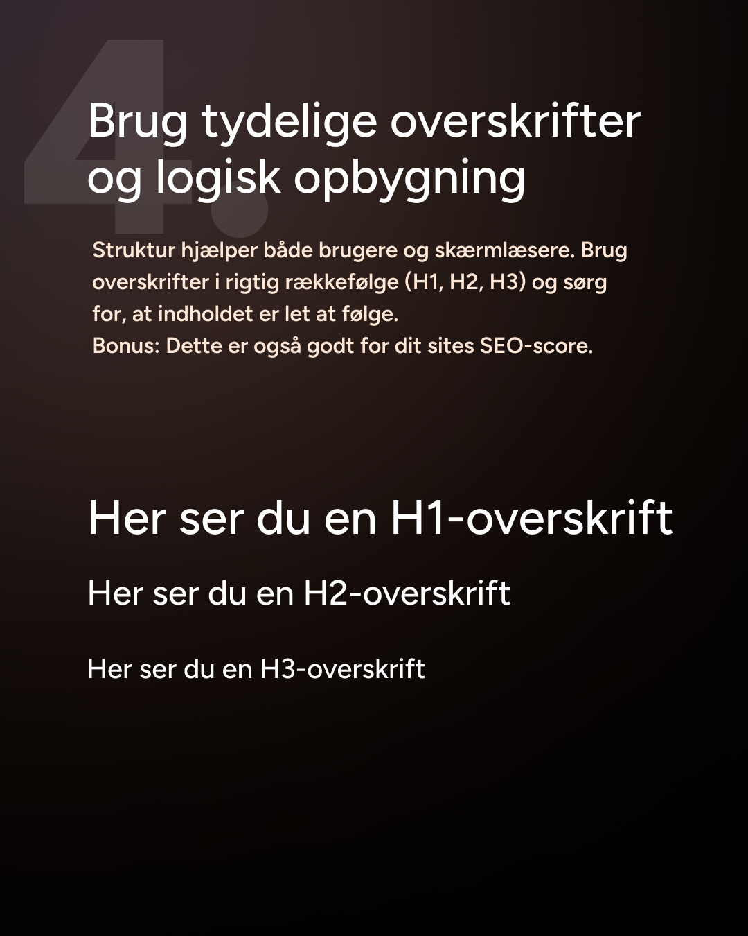 H1, H2, H3 – det er ikke bare pænt, det giver også struktur. For både mennesker og skærmlæsere. Og igen: SEO vinder også.