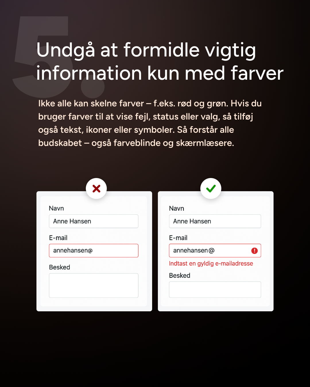 “Den røde fejlmeddelelse” virker ikke, hvis man ikke kan se farven rød. Brug også tekst, ikoner eller symboler.
