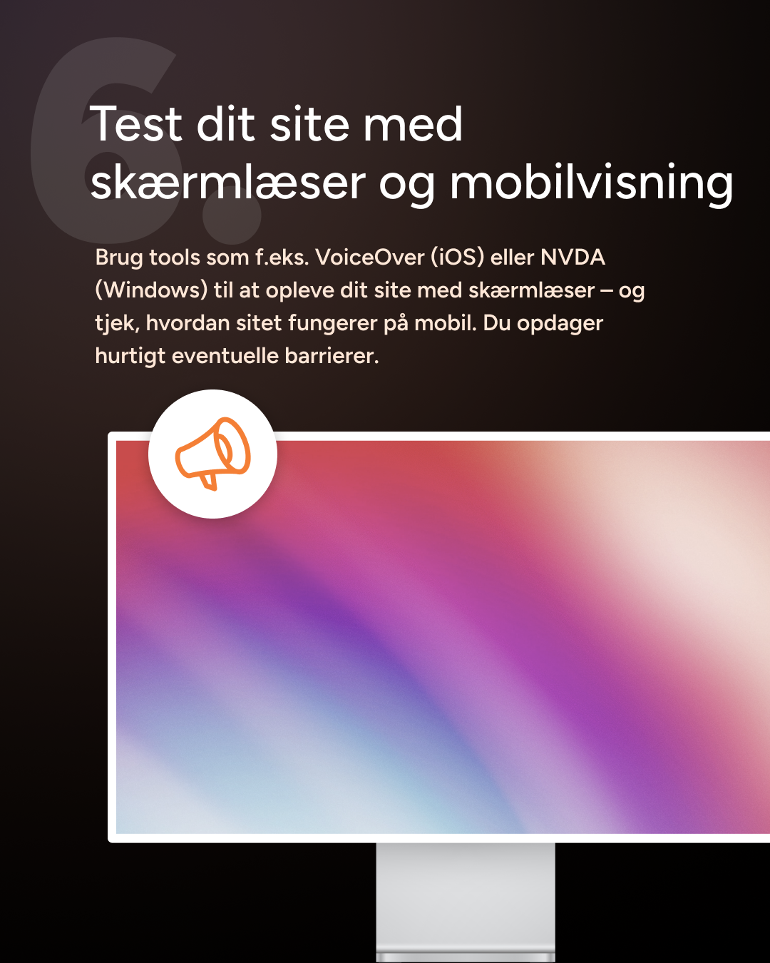 Du behøver ikke være ekspert. Brug f.eks. VoiceOver (iOS) eller NVDA (Windows) og mærk selv oplevelsen. Ofte er det her, du opdager de største barrierer.