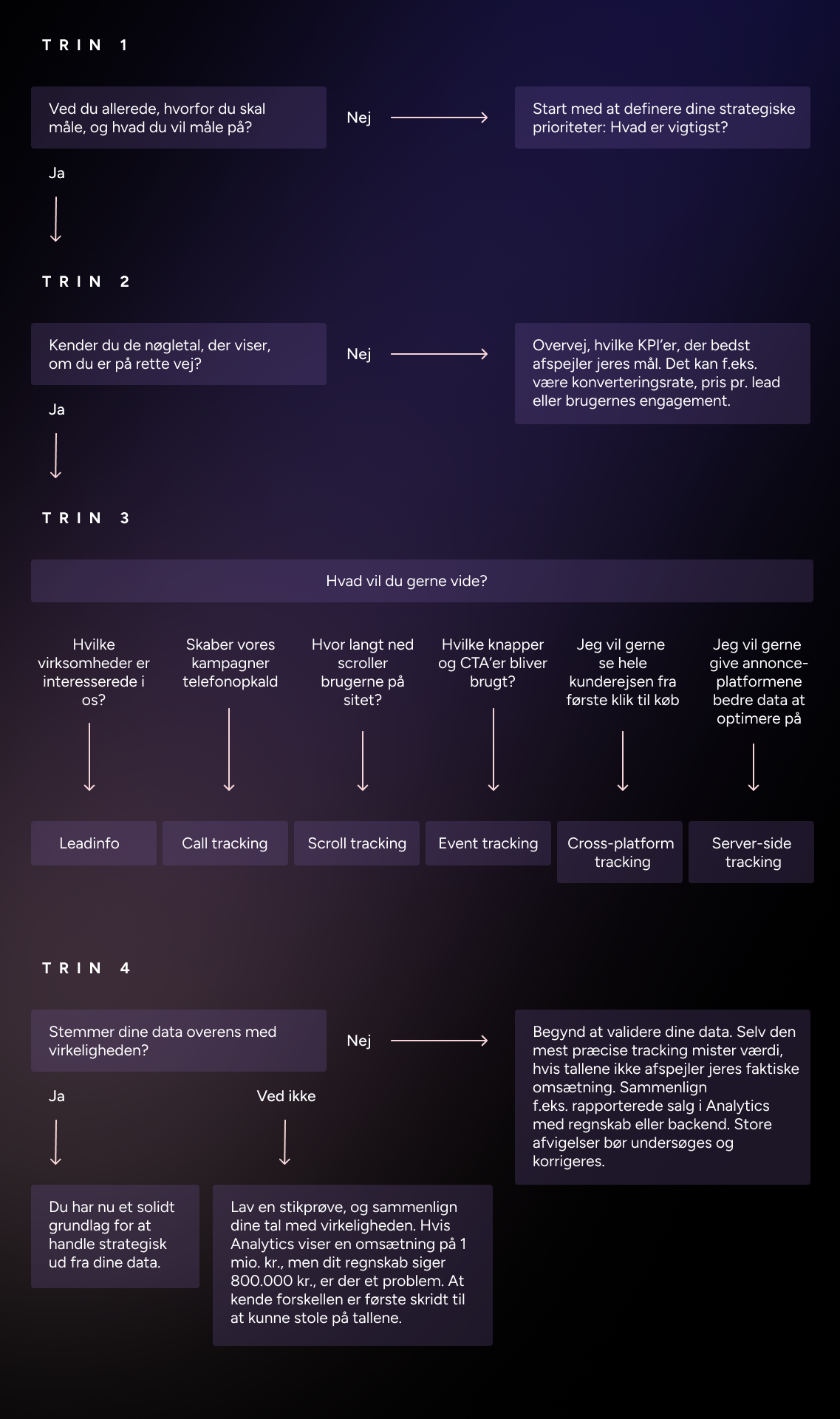 Hvis du føler, at tracking hurtigt bliver teknisk og uoverskueligt, så bare ro på. Vi giver dig en guide i fire trin, der hjælper dig med at komme fra fluffy data til et solidt grundlag, du kan handle på.